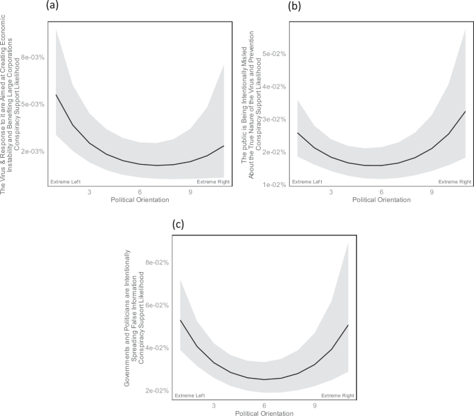 The y-axis shows the support likelihood for the given conspiracy theory at different levels of the x-axis, which represents participants’ political orientation. Note that “extreme left” and “extreme right” reflect the endpoint response options of the scale. Panel (a) represents the support for the conspiracy theory that the coronavirus or the government’s response to it are a deliberate strategy to create economic instability or to benefit large corporations over small businesses. Panel (b) represents the support for the conspiracy theory that the public is being intentionally misled about the true nature of the Coronavirus, its risks, or the efficacy of certain treatments or prevention methods. Panel (c) represents the support for the conspiracy theory that politicians or government agencies are intentionally spreading false information, or they have some other motive for the way they are responding to the coronavirus. The black line represents the estimated mean at a given x-axis level and ribbons represent 95% confidence intervals.