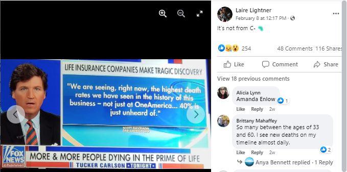 The statement about a 40 percent rise, made by an Indiana insurance executive, has been used on social media to make various claims about death rates and COVID, including this February 8, 2022 Facebook post (archived here) under the title “It’s not from the C-.” It opens: