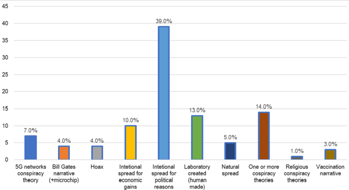 All of the studies examined various conspiracy theories, such as the 5G network theory, the theory of laboratory-created SARS-CoV-2, the theory of intentional spread of the virus, the Bill Gates/ microchip/ vaccine narrative, with the exception of one study which examined non-specific, SARS-CoV-2 related conspiracy ideation[34]. The overall percentage of participants from 28 studies (including qualitative studies) who reported agreeing with one or more conspiracy beliefs ranged from 0.4 to 82.7% [8, 17,18,19,20,21,22,23, 28,29,30, 32, 33, 35,36,37,38, 40, 41, 43,44,45,46, 48, 52, 53, 57, 58]. Because most studies provided average percentages of the different narratives calculated altogether, as well as the overlap of various conspiracy theories, it could not be determined whether certain conspiracy theories were more widespread than others. However, when we grouped them into the above-mentioned narratives/categories, only 5.0% believed in the natural origin and spread of the virus, while 39.0% believed in the intentional spread of the virus for political reasons (Fig. 2).