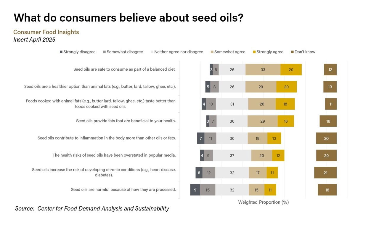 Most consumers are somewhat familiar with seed oils, but overall, they feel unsure or neutral about common claims regarding the link between the oils and negative health outcomes, according to the April Consumer Food Insights Report (CFI).