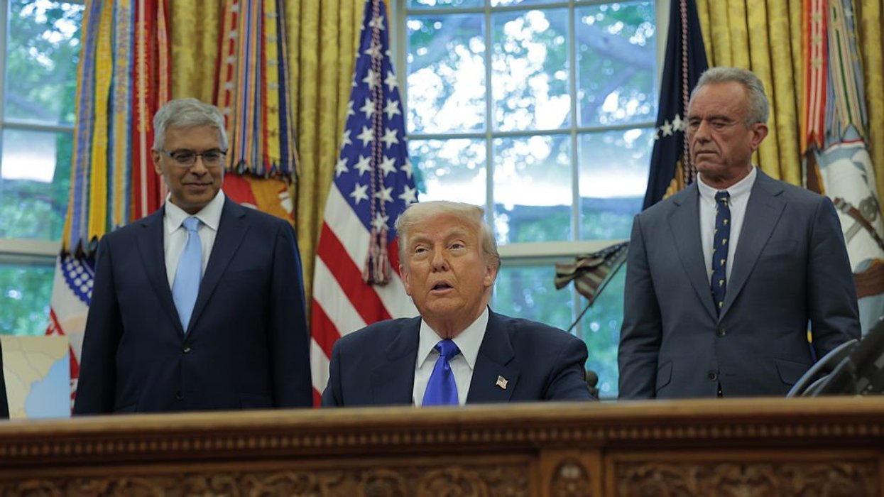 National Institutes of Health Director Jayanta Bhattacharya, U.S. President Donald Trump, Health and Human Services Secretary Robert F. Kennedy Jr. Photo by Anna Moneymaker/Getty Images
